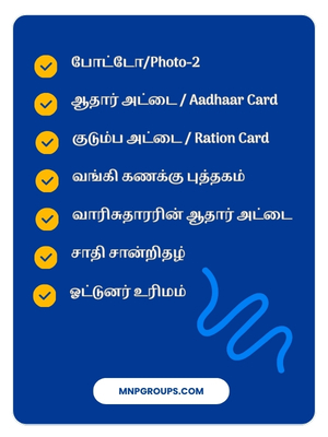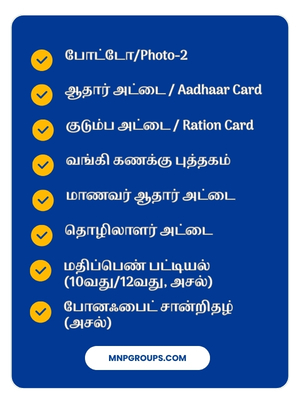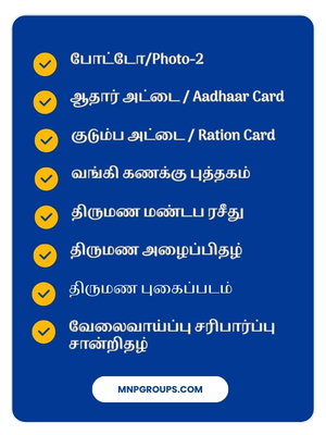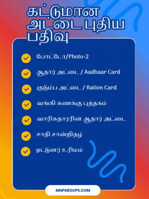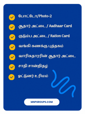 - விண்ணப்பத் சமர்ப்பிக்கவும் விண்ணப்பத் பதிவு செய்யஇ-சேவை மையத்தில் இருக்கும்ஆபரேட்டரிடம்உங்கள் தகவல்களை பகிரவும், விண்ணப்பம் பதிவு செய்ததும் அந்த சேவைக்குத் தேவையான கட்டணத்தை (ஏதேனும் இருந்தால்) செலுத்திரசீதை பெற்றுக்கொள்ளவும்.